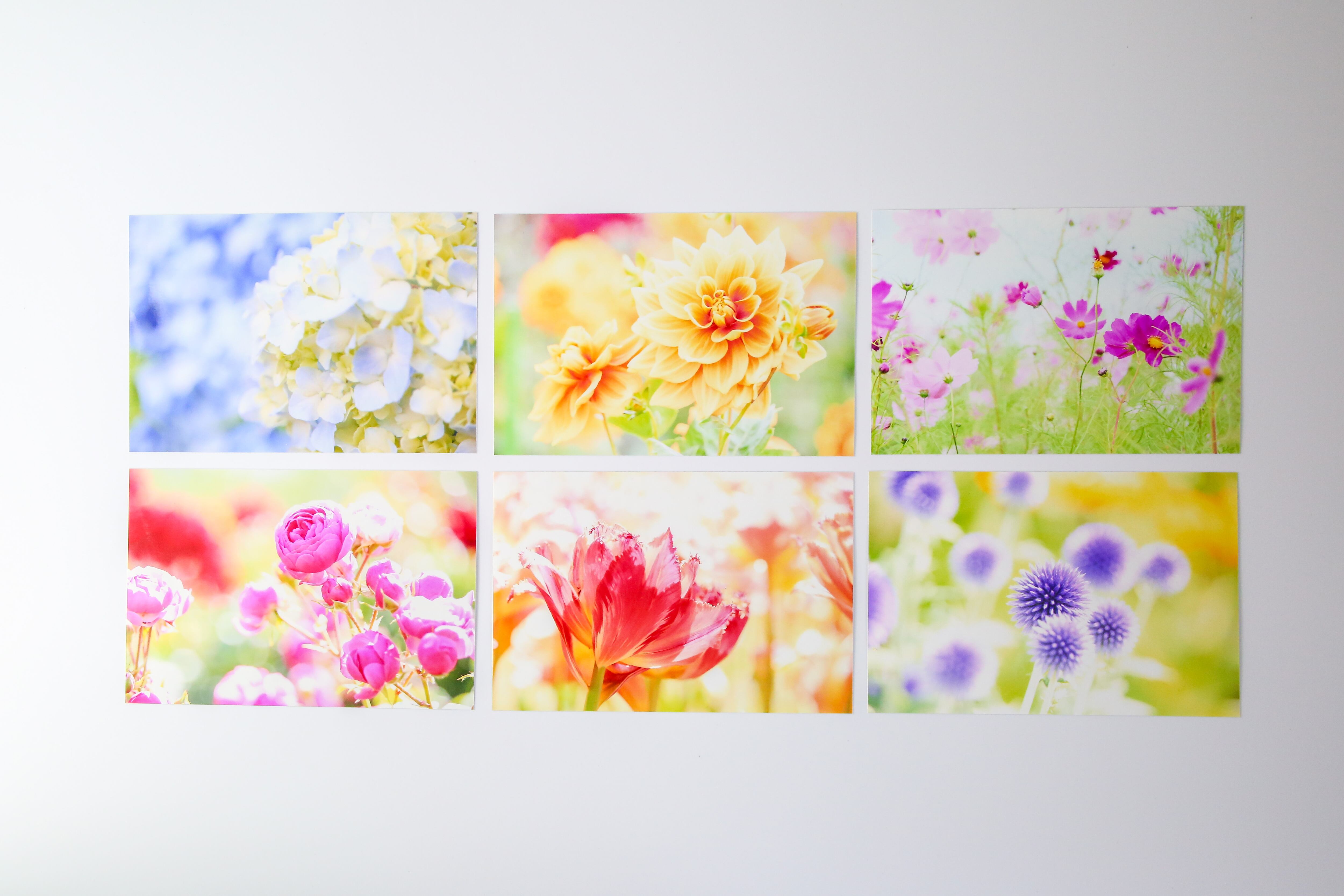ダリア・バラ・コスモス・紫陽花・チューリップ・アザミの生写真6枚セットです。 KGサイズ(15.2cm×10.2cm)ハガキくらいの大きさです。